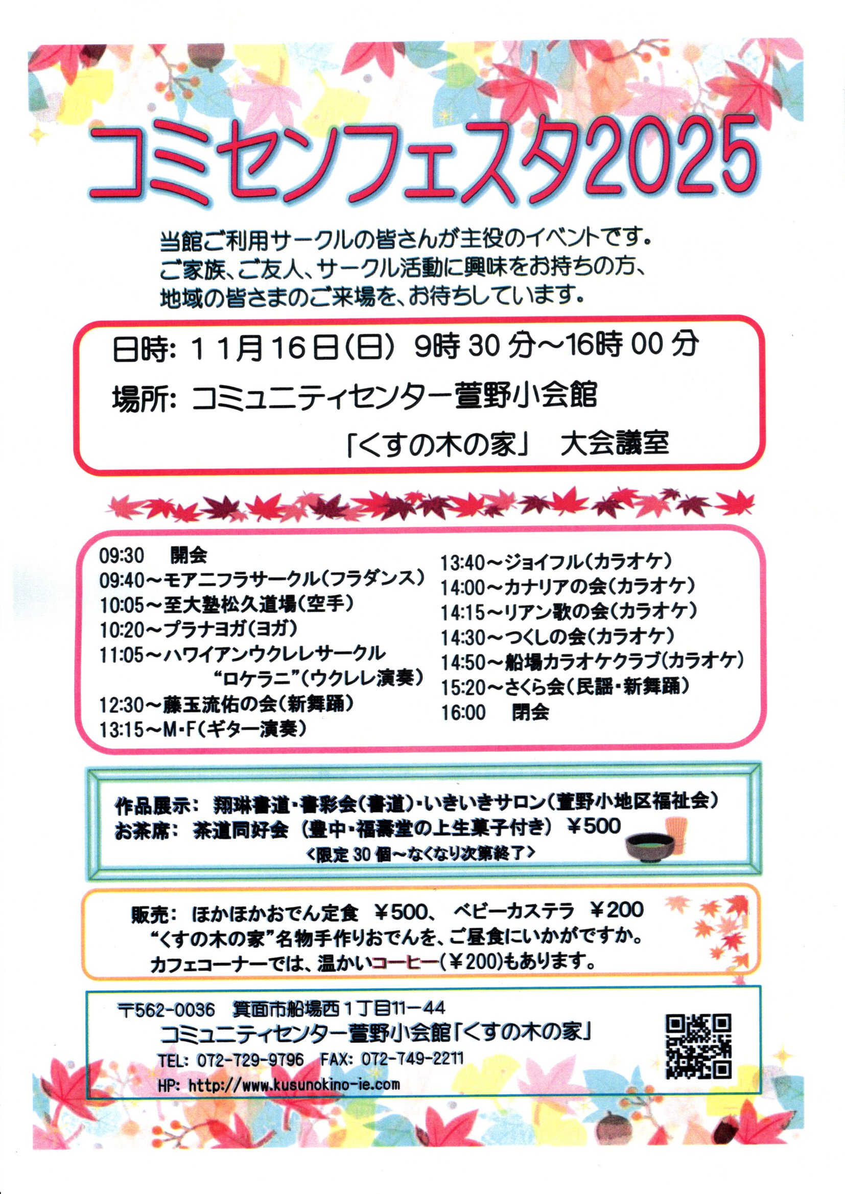 「笑顔をつなぐ、みんなの広場!」 ようこそ!コミセンホームページへ。 地域の皆様の相互コミュニケーションをお手伝いし皆様の憩いの場となれるよう、 当コミセンでのイベントやサークル活動情報をお届けいたします。 また、ご利用案内は「コミセン」ページに掲載しています。 どうぞ、ごゆるりとご覧ください。 Community Center 萱野小会館「くすの木の家」 管理運営委員会一同 ![]() ●「コミセンフェスタ2025! 日時:11月16日(日) 9:30~16:00 場所:当館 大会議室 内容:各サークルによる実演・展示など、日頃当館を ご利用のサークルの皆さんが主役のイベントです。 ~サークルさんによる発表・展示をぜひ皆さん、 ご覧ください。プログラムは下記の通りです。 当日は、おいしいお食事もご用意しています。 近隣の皆様のご来館、お待ちしています♪~ ![]() ●「コミセン子ども夏まつり」開催しました! 9月27日(土) 爽やかな天気にめぐまれ、 朝9:00のスタートから、たくさんの子どもたちが 来場してくれました。 体力測定やストラップ釣り、ダーツに輪投げなど おなじみのコーナーは大賑わいでした。 そして今年のゲスト、人形劇団ピピさんの公演も 大人気!終演後も、子どもたちがお人形に夢中でした。 お楽しみいただけましたでしょうか? また、子どもたちが描いたぬりえは、館内でご覧いた だけます♪ みなさん、ご来場ありがとうございました! ![]() 体力測定挑戦中! 校区子ども会のお店は大人気の紙バッグ作り♪ ![]() 人形劇団ピピさんによる公演「三枚のお札」 最後は、抽選会で大賑わい。 ☆忘れ物・落とし物のお知らせ お心当たりの方は、事務所まで。●「第2回ファミリーダーツのつどい」参加者募集! 日時:10月18日(土)13:00~16:00予定 場所:当館小会議室 今年度2回目の「ファミリーダーツのつどい」を開催 します。初心者の方には、丁寧なご指導もいただけます。 運動と脳トレが同時にかなうスポーツです。 ぜひ一度、チャレンジしてみてください! 皆さまのご参加をお待ちしています! 詳細はコチラ ![]() リンクからバックナンバーをご覧いただけます。 information