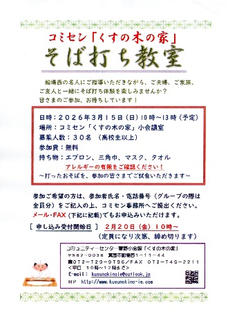 「笑顔をつなぐ、みんなの広場!」 ようこそ!コミセンホームページへ。 地域の皆様の相互コミュニケーションをお手伝いし皆様の憩いの場となれるよう、 当コミセンでのイベントやサークル活動情報をお届けいたします。 また、ご利用案内は「コミセン」ページに掲載しています。 どうぞ、ごゆるりとご覧ください。 Community Center 萱野小会館「くすの木の家」 管理運営委員会一同 ![]() ●「そば打ち教室」参加者募集! 日時:3月15日(日) 10時~13時 場所:コミセン「くすの木の家」小会議室 名人に教わりながらそば打ちを体験していただきます。 打ったおそばは、参加の皆さまでご試食いただけます。 募集は先着30名です。2月20日10時から受付を 始めます。詳しくは、ポスターをご覧ください。 お申込み、お待ちしています♪ ![]() ●萱野小地区福祉会主催「萱野ひろば」がやってきます♪ 日時:2月21日(土) 11時~13時 長年、世代間交流会として開催されているイベントです。 ダーツやけん玉、あてものなど懐かしい遊びを皆んなで 楽しみませんか?美味しいカレーもありますよ♪ ぜひ、お越しください。 ![]() ![]() ●「全館ワックス掛け」の予定 日時:3月28日(土) 全日 当日は、全館使用できません。 ![]() ●「コミセンだより82号」発行いたしました! 当館広報誌「コミセンだより」82号、2月13日発行 いたしました。萱野小学校校区内のご家庭に、 順次配布されます。当館の催し、サークルや地域交流を ご紹介しています。「コミセンだより」ぺージからも バックナンバーをご覧いただけます。 ![]() ●第19回「新春カラオケ大会」開催しました♪ 日時:1月25日(日) 13:00~16:30 場所:当館 大会議室 恒例の当館新年初めての催し「新春カラオケ大会」は、 今年も40名の出演者、たくさんの応援のお客様で 賑わった3時間でした。皆さまの笑顔とご一緒に 楽しい時間を過ごすことができました。 皆さま、ご参加ありがとうございました。 リンクからバックナンバーをご覧いただけます。 information