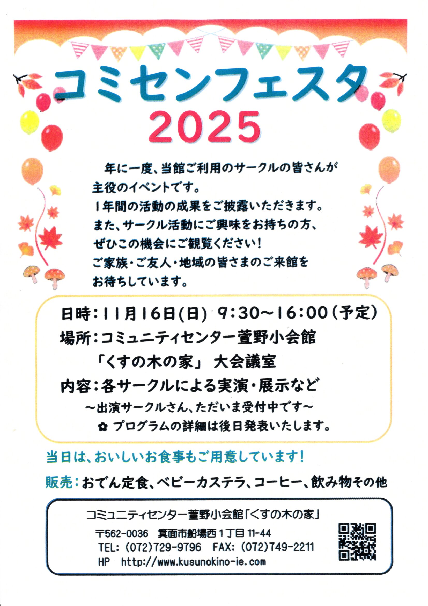 「笑顔をつなぐ、みんなの広場!」 ようこそ!コミセンホームページへ。 地域の皆様の相互コミュニケーションをお手伝いし皆様の憩いの場となれるよう、 当コミセンでのイベントやサークル活動情報をお届けいたします。 また、ご利用案内は「コミセン」ページに掲載しています。 どうぞ、ごゆるりとご覧ください。 Community Center 萱野小会館「くすの木の家」 ![]() ![]() ●「コミセンフェスタ2025! 日時:11月16日(日) 9:30~16:00 場所:当館 大会議室 内容:各サークルによる実演・展示など ~出演サークルさん、ただいま受付中です~ 当日は、おいしいお食事もご用意しています。 近隣の皆様、是非ご来館ください。 ![]() ![]() ●「コミセン子ども夏まつり」開催しました! 9月27日(土) 爽やかな天気にめぐまれ、 朝9:00のスタートから、たくさんの子どもたちが 来場してくれました。 体力測定やストラップ釣り、ダーツに輪投げなど おなじみのコーナーは大賑わいでした。 そして今年のゲスト、人形劇団ピピさんの公演も 大人気!終演後も、子どもたちがお人形に夢中でした。 お楽しみいただけましたでしょうか? また、子どもたちが描いたぬりえは、館内でご覧いた だけます♪ みなさん、ご来場ありがとうございました! ![]() ![]() 体力測定挑戦中! 校区子ども会のお店は大人気の紙バッグ作り♪ ![]() ![]() 人形劇団ピピさんによる公演「三枚のお札」 最後は、抽選会で大賑わい。 ☆忘れ物・落とし物のお知らせ ![]() ![]() ●「第2回ファミリーダーツのつどい」参加者募集! 日時:10月18日(土)13:00~16:00予定 場所:当館小会議室 今年度2回目の「ファミリーダーツのつどい」を開催 します。初心者の方には、丁寧なご指導もいただけます。 運動と脳トレが同時にかなうスポーツです。 ぜひ一度、チャレンジしてみてください! 皆さまのご参加をお待ちしています! 詳細はコチラ ![]() ![]() リンクからバックナンバーをご覧いただけます。 information