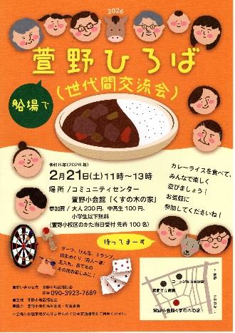 「笑顔をつなぐ、みんなの広場!」 ようこそ!コミセンホームページへ。 地域の皆様の相互コミュニケーションをお手伝いし皆様の憩いの場となれるよう、 当コミセンでのイベントやサークル活動情報をお届けいたします。 また、ご利用案内は「コミセン」ページに掲載しています。 どうぞ、ごゆるりとご覧ください。 Community Center 萱野小会館「くすの木の家」 管理運営委員会一同 ![]() ●「そば打ち教室」参加者募集! 日時:3月15日(日) 10時~13時 場所:コミセン「くすの木の家」小会議室 名人に教わりながらそば打ちを体験していただきます。 打ったおそばは、参加の皆さまでご試食いただけます。 募集は先着30名です。2月20日10時から受付を 始めます。詳しくは、ポスターをご覧ください。 お申込み、お待ちしています♪ ![]() ●萱野小地区福祉会主催「萱野ひろば」がやってきます♪ 日時:2月21日(土) 11時~13時 長年、世代間交流会として開催されているイベントです。 ダーツやけん玉、あてものなど懐かしい遊びを皆んなで 楽しみませんか?美味しいカレーもありますよ♪ ぜひ、お越しください。 ![]() ![]() ●「全館ワックス掛け」の予定 日時:3月28日(土) 全日 当日は、全館使用できません。 ![]() ●「コミセンだより82号」発行いたしました! 当館広報誌「コミセンだより」82号、2月13日発行 いたしました。萱野小学校校区内のご家庭に、 順次配布されます。当館の催し、サークルや地域交流を ご紹介しています。「コミセンだより」ぺージからも バックナンバーをご覧いただけます。 ![]() ●第19回「新春カラオケ大会」開催しました♪ 日時:1月25日(日) 13:00~16:30 場所:当館 大会議室 恒例の当館新年初めての催し「新春カラオケ大会」は、 今年も40名の出演者、たくさんの応援のお客様で 賑わった3時間でした。皆さまの笑顔とご一緒に 楽しい時間を過ごすことができました。 皆さま、ご参加ありがとうございました。 リンクからバックナンバーをご覧いただけます。 information